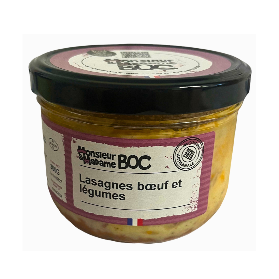 Liste des ingrédients : Egrené de bœuf origine France 24,5%, coulis de tomate 12,3% (tomate, huile de tournesol, oignon, sucre, sel, basilic), pâtes alimentaires 5,8% (semoule de blé dur, œufs pasteurisés, eau, sel, huile d'olive), champignon 4,9%, oignon 4,9%, carotte 4,9%, potiron 4,9%, lait demi-écrémé, emmental, beurre, farine de blé, huile de tournesol et d'huile d'olive vierge extra, sel, muscade, poivre